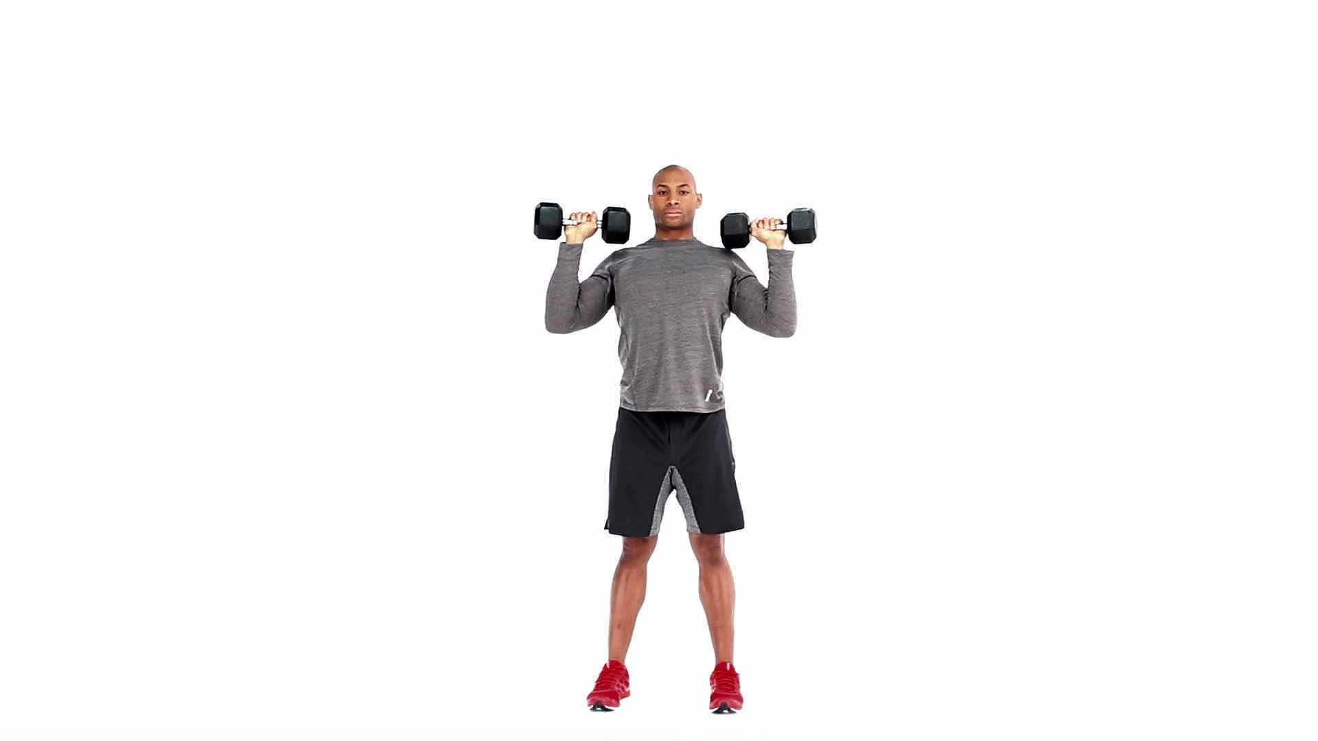 2- Начиная с согнутых локтей, нажмите на гантели на длину рук, а затем снова опустите их.